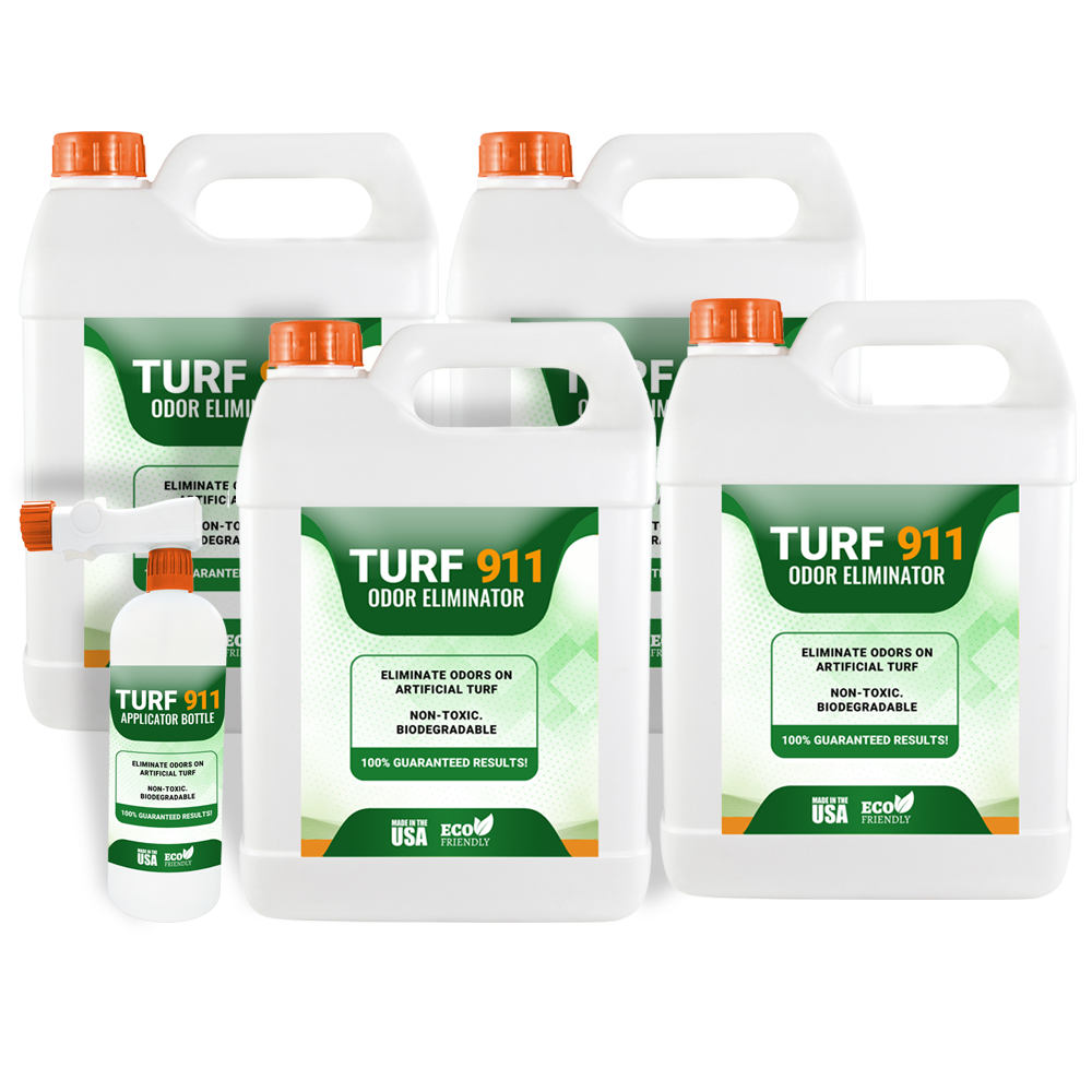 • TURF 911’s Super-charged, bio-active enzymes specifically target the odor causing proteins that are found in organic waste. Our unique formula works to dissolve the urine crystals quickly, effectively neutralizing urine odors on turf and all other outdoor surfaces.